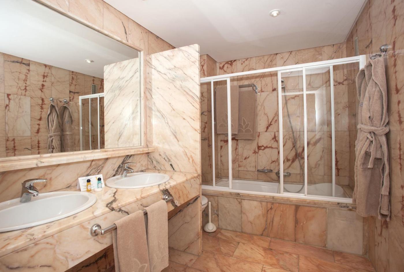 Suite de 2 dormitorios. Esta suite se encuentra en la 5.ª planta y dispone de balcón grande, bañera de hidromasaje y sauna. Dispone de 2 dormitorios y 2 baños, uno con ducha de hidromasaje y el otro con bañera de hidromasaje. Hay una cocina de planta abierta y un salón comedor independiente con sofá cama y TV vía satélite. Incluye WiFi gratis. El aire acondicionado está disponible en junio, julio, agosto y septiembre.
